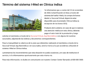 Desde el 23 de noviembre, y de acuerdo a lo indicado vía correo electrónico a cada uno de sus pacientes, Clínica Indisa terminó “con la emisión de bonos para las isapres Banmédica y Vida Tres en consultas médicas, exámenes y procedimientos (ámbito ambulatorio), esto significa para los afiliados, que al momento de realizar la atención deberá cancelar directamente a Indisa el valor de la prestación, para luego solicitar el reembolso en su isapre contra boleta de ventas”.